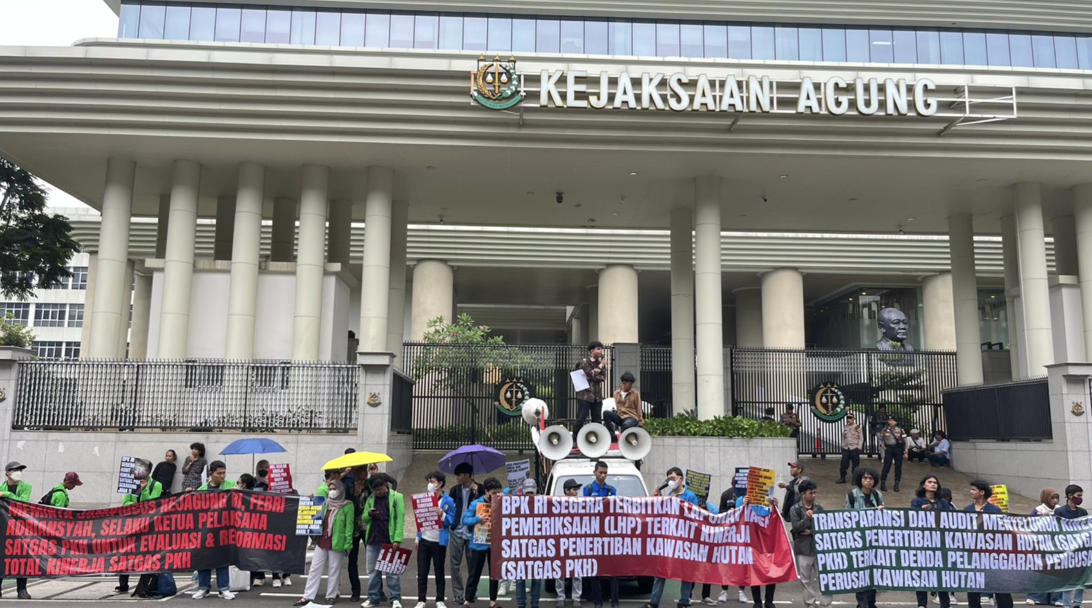 Dalam tuntutannya, mahasiswa mendesak Badan Pemeriksa Keuangan (BPK) segera turun tangan melakukan audit menyeluruh terhadap kinerja Satgas PKH.